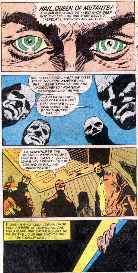 The man behind this is mysterious gathering is Mesmero, a pupil of Magneto's, who has an army of Demi-Men (generic robots) at his command. Interestingly, he used a device constructed by Magneto to boost his poorly-defined hypnotic powers to the point where he was able to affect mutants across the entire nation. This was more like the modern conception of Cerebro than Cerebro itself was at the time.